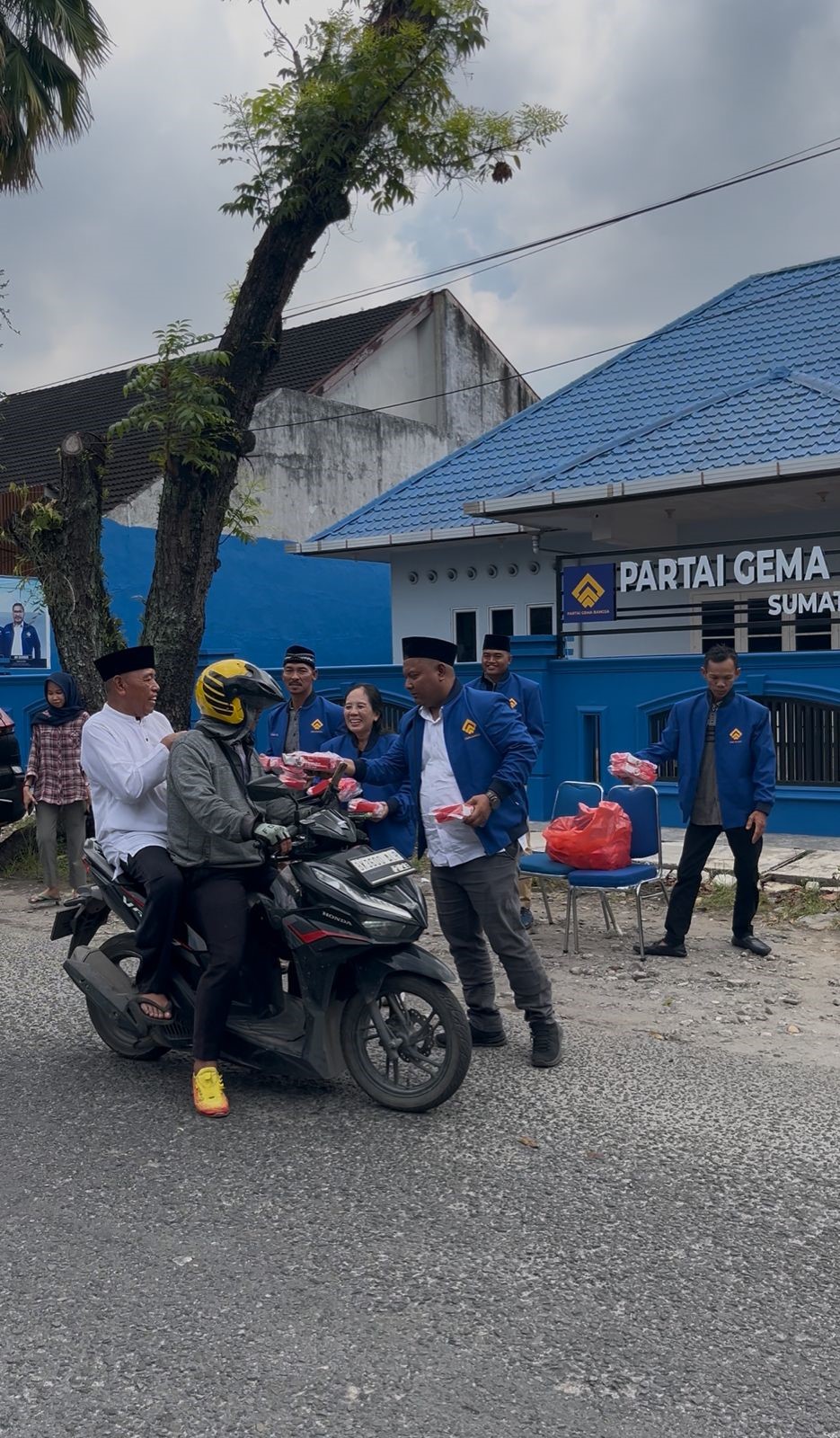 Pembagian nasi bungkus dilakukan dengan tertib, didampingi oleh para relawan dan pengurus partai yang mengenakan atribut khas Partai Gema Bangsa. Senyum hangat, sapaan ramah, dan doa kebaikan mengiringi setiap paket yang dibagikan, mempertegas pesan bahwa partai hadir sebagai sahabat masyarakat.